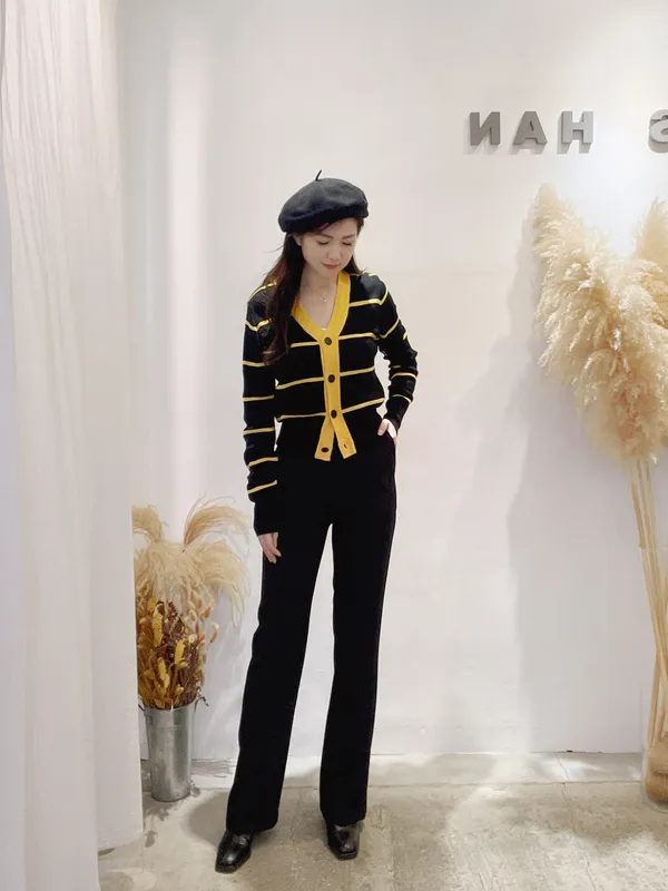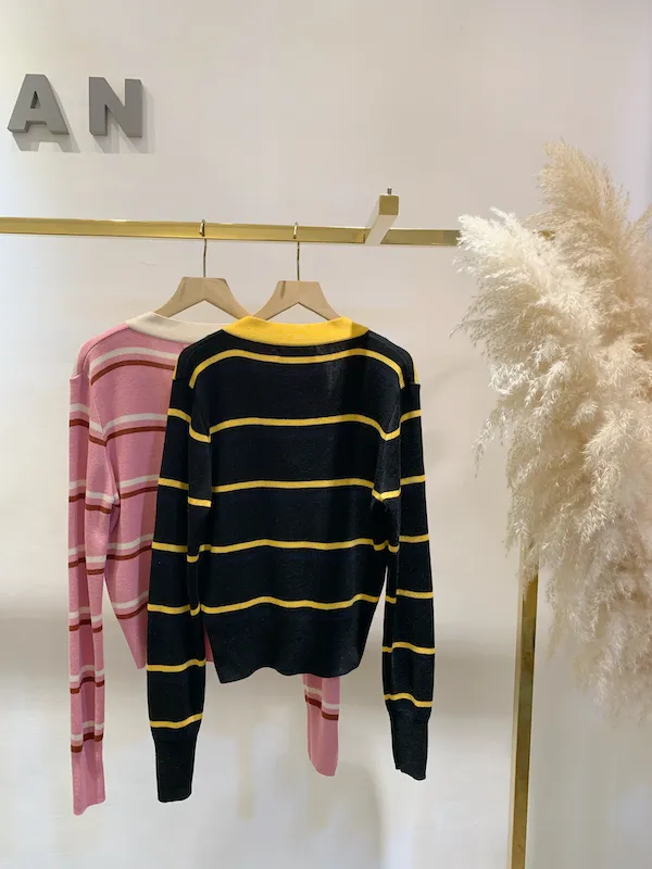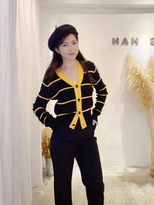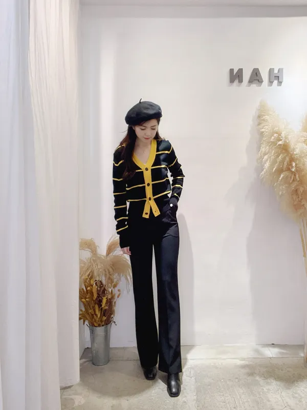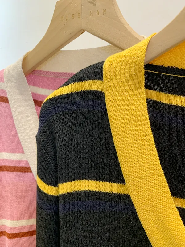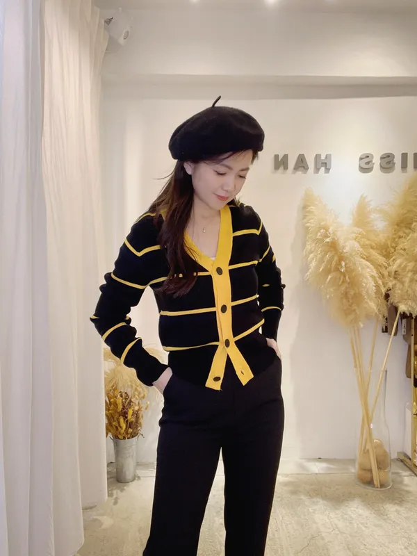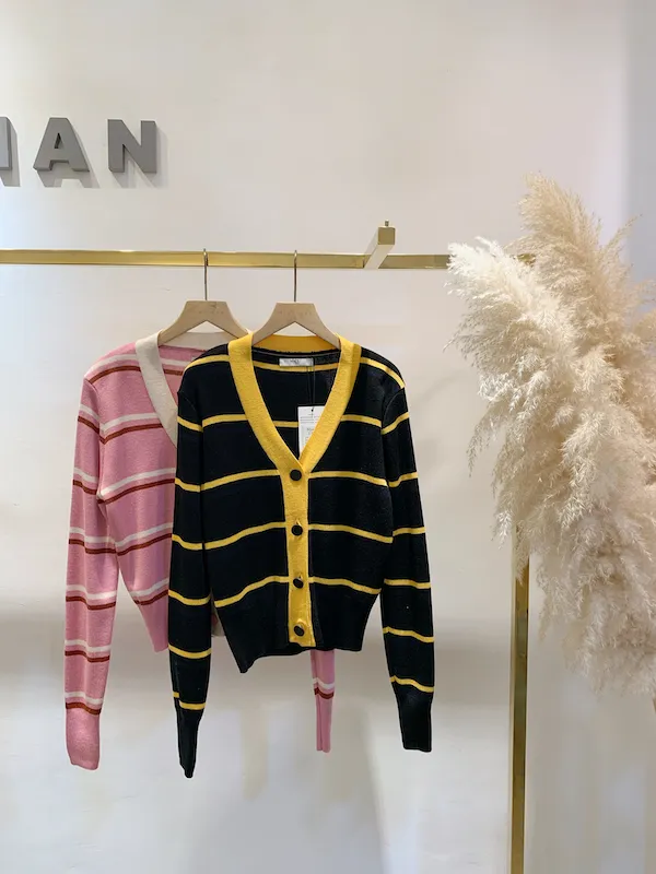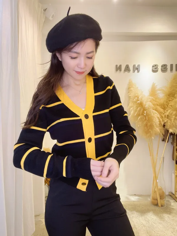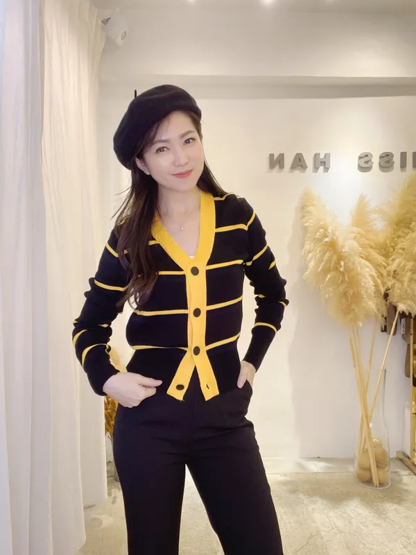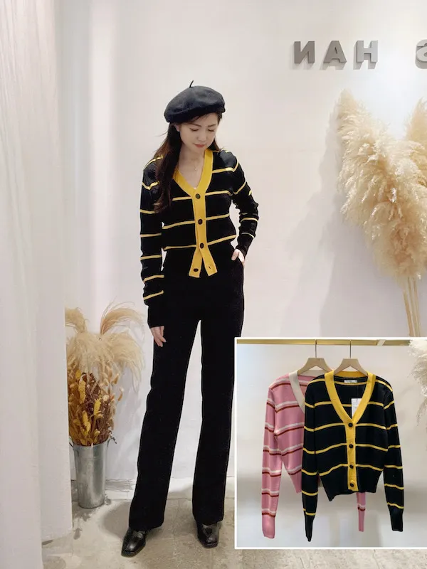 圓釦條紋撞色針織外(影音)