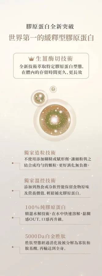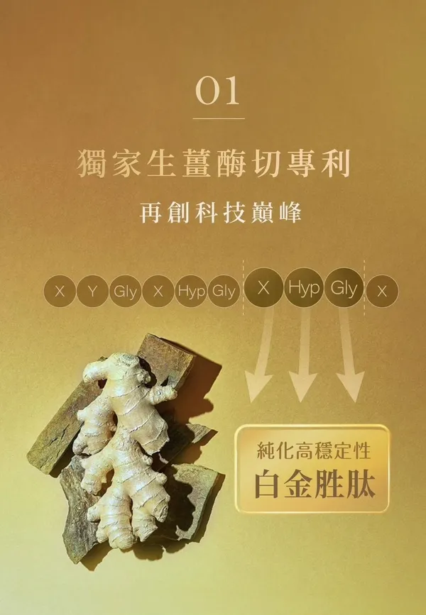 全球獨家專利【生薑酶水解技術】,精製出更細小、更易吸收的膠原蛋白小分子「GFF-01白金胜肽」,其高效吸收與緩釋特性,能迅速進入體內並長效發揮作用,猶如你「膠原結構」編織的「補強網」,細膩且迅速的修復與滋養,為全身注入活力。