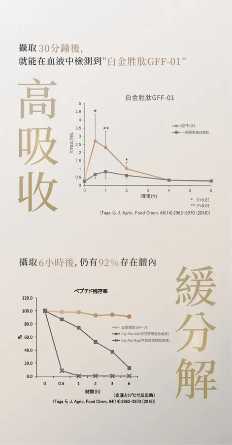 「GFF-01白金胜肽」是一種「高效緩釋型」的膠原蛋白小分子,不僅吸收迅速,還能在體內穩定停留,持續發揮作用,讓保養效果更持久!