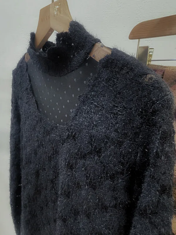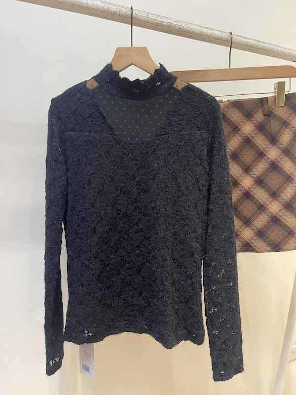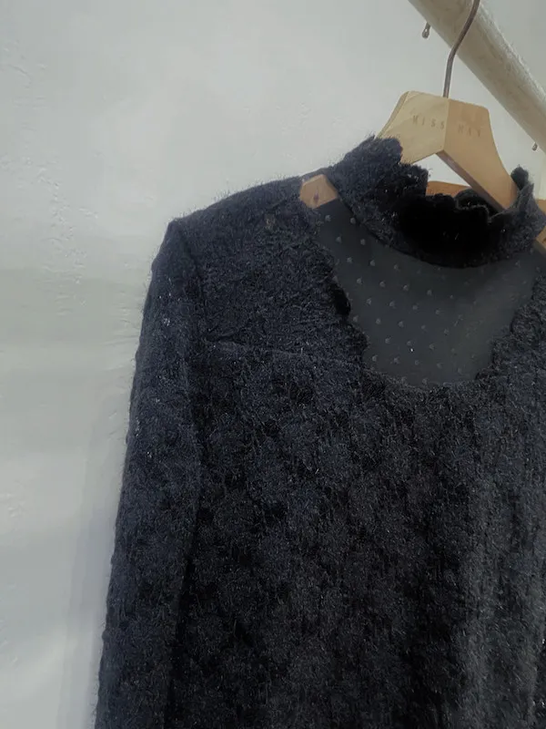 最吸睛的V型鏤空領口拼接點點透膚網紗