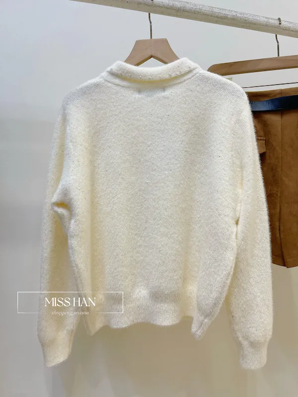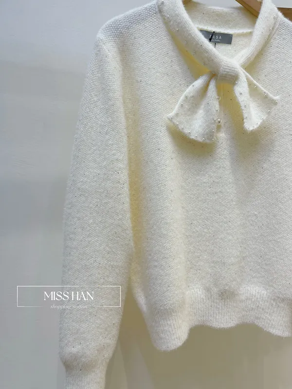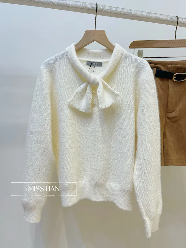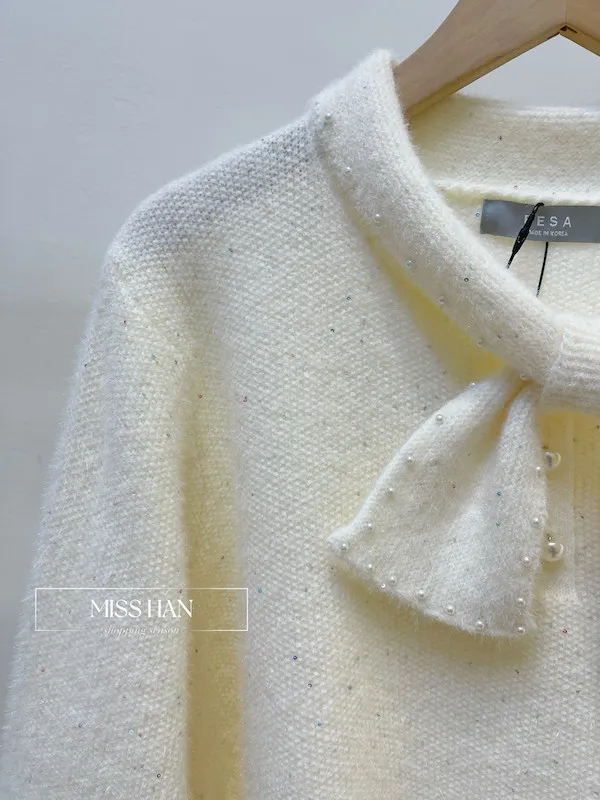 這款優雅蝴蝶結珍珠毛衣以純淨米白色調結合柔軟親膚的毛絨材質 散發溫柔名媛氣息 亮點在於領口精緻的大蝴蝶結設計並點綴閃耀珍珠 細看更有微閃亮片點綴 極具層次感 搭配簡約下身即可展現正韓高質感 是秋冬約會或正式場合的完美穿搭首選