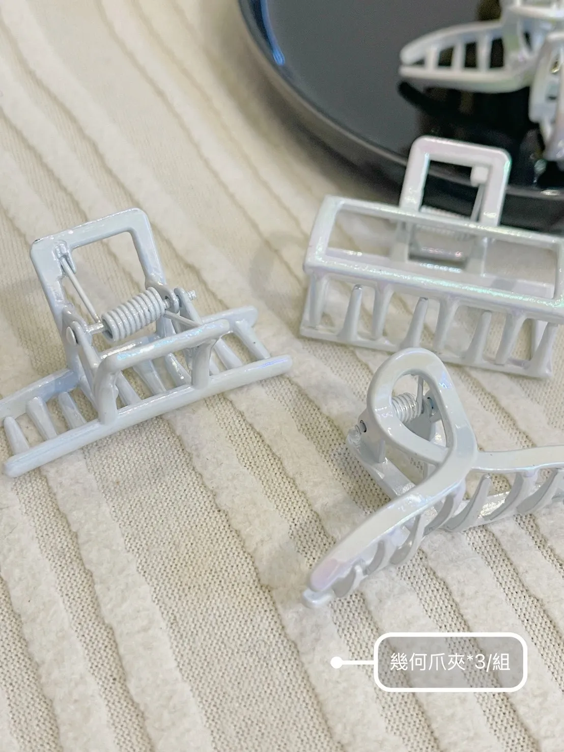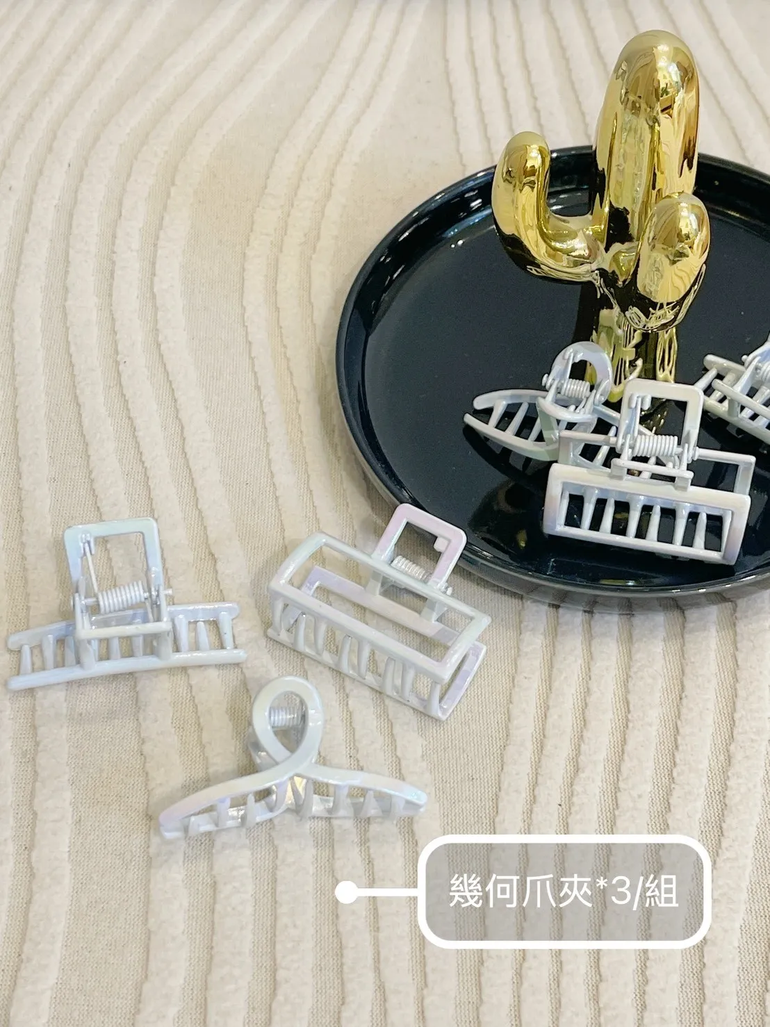 【極簡美學 ✨ 珍珠光幾何爪夾 3入組】 絕美極光質感,隨光影變幻迷人色澤!一組收齊三款經典幾何造型:簡約方框與流線弧度,隨手一夾即散發慵懶韓系氛圍質感溫潤百搭,完美搞定日常髮型細節,讓妳的穿搭從頭精緻到腳。