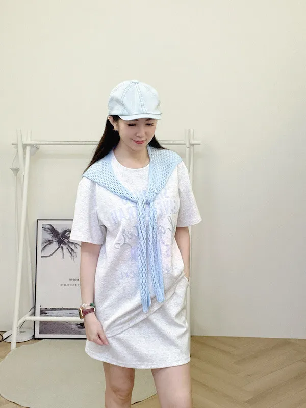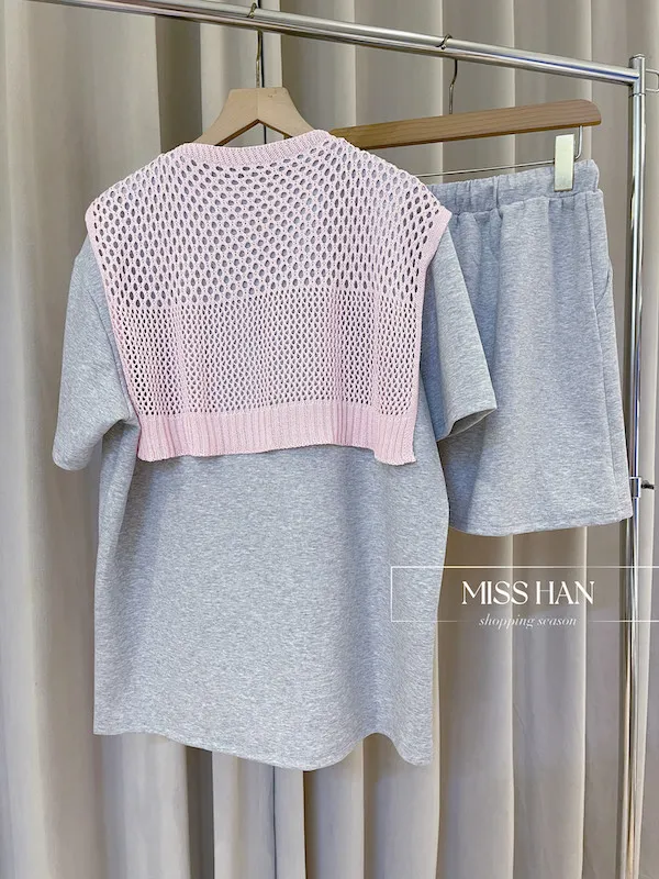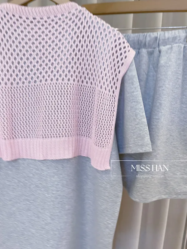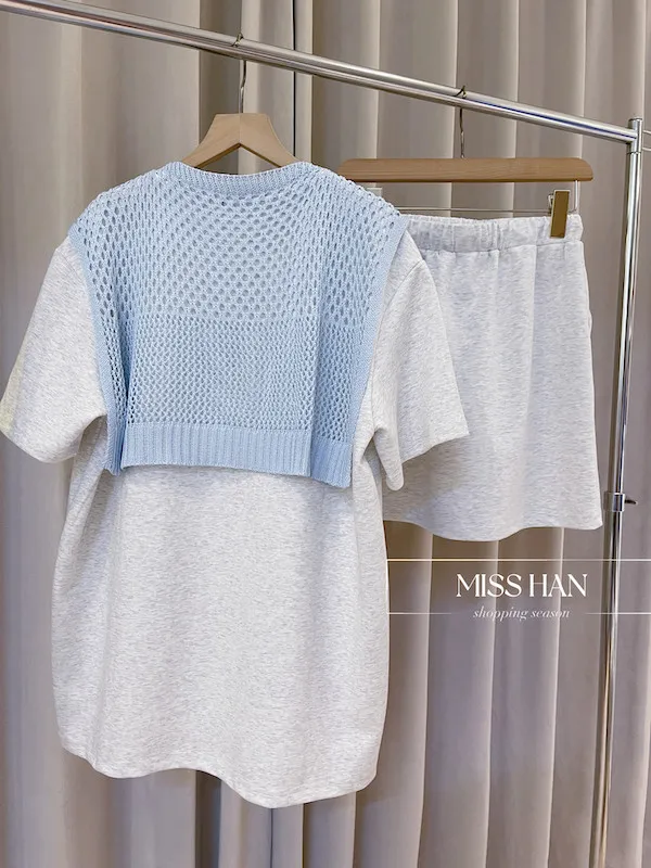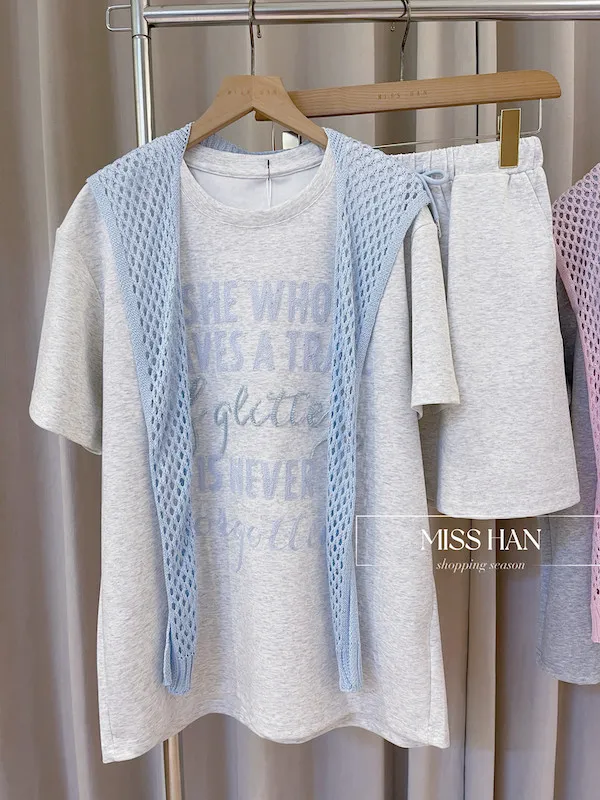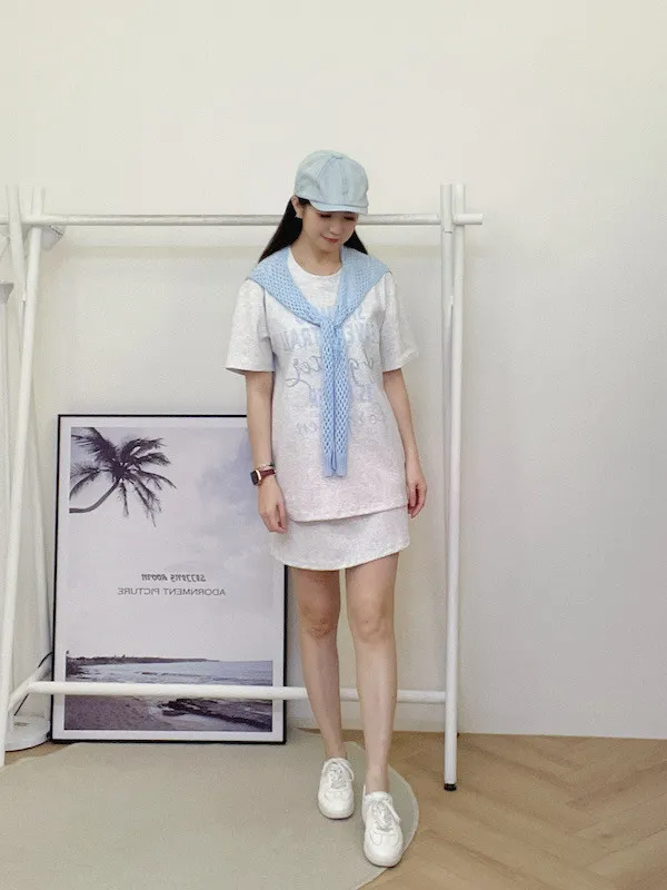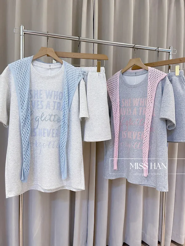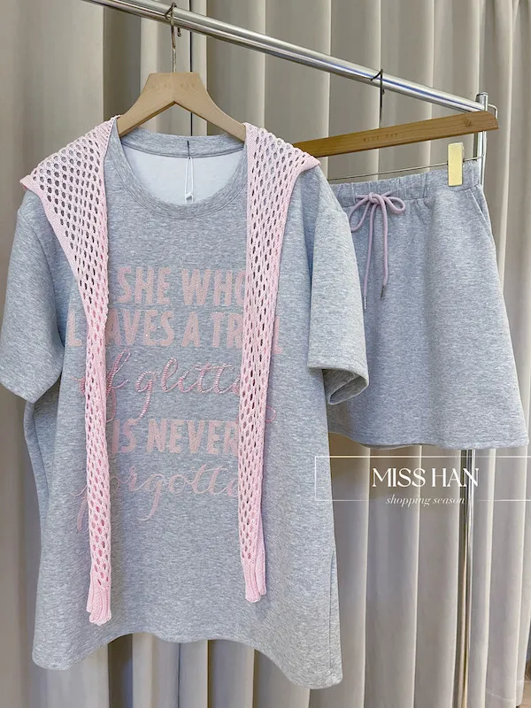 整套包含字母 T-shirt、口袋短裙及鏤空針織披肩