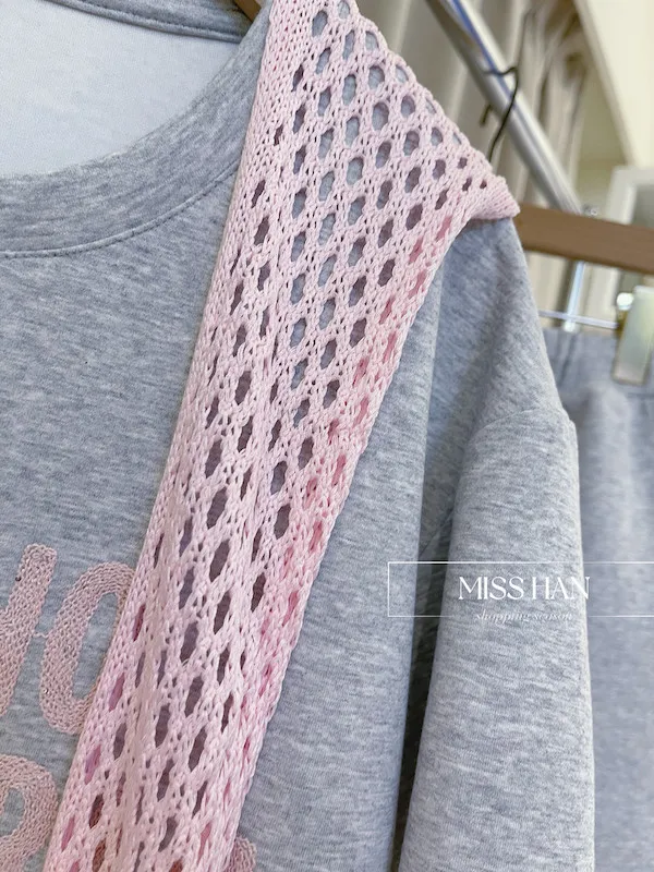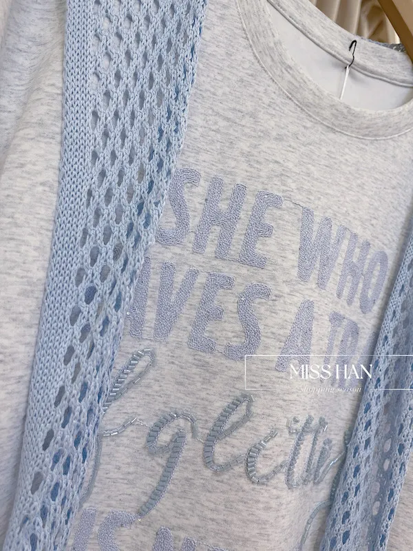立體質感: 胸前文字採用細膩的亮片與珠飾工藝,為簡約的灰色基底增添閃爍的高級感。