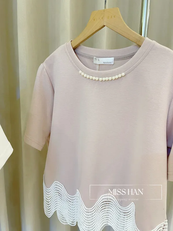珍珠裝飾領口: 圓領處綴有細膩的珍珠排飾,自帶奢華感,不需額外配戴項鍊也能亮眼動人。