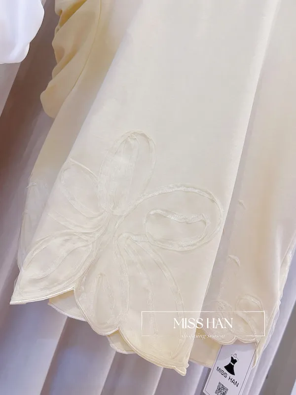 工藝下襬: 獨特的大花朵輪廓搭配不規則波浪邊緣,為穿搭注入豐富的立體層次。