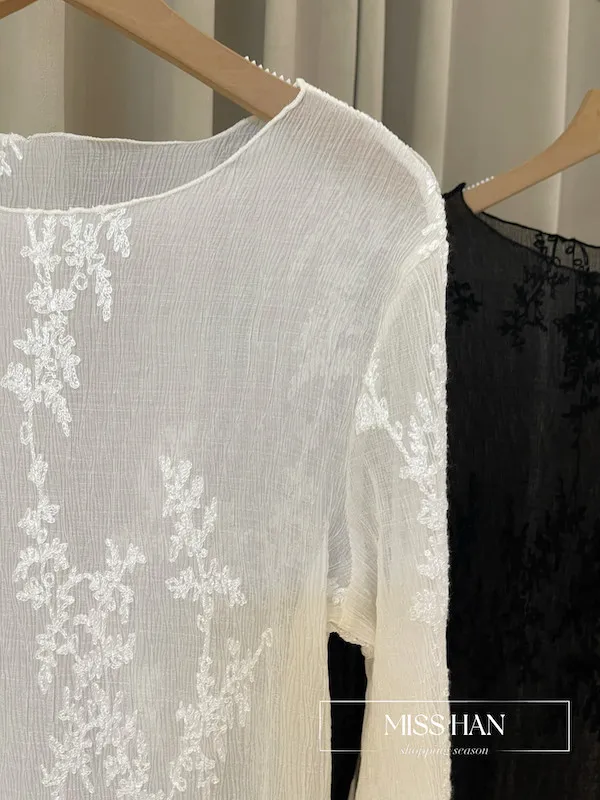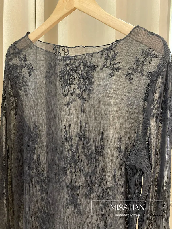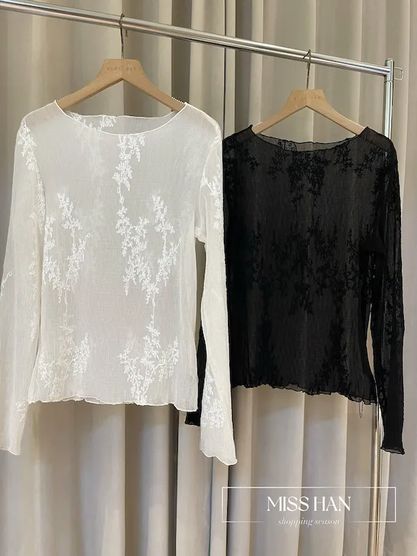 這款新款上衣精選柔霧透膚鏤空面料,點綴立體植絨質感非凡。