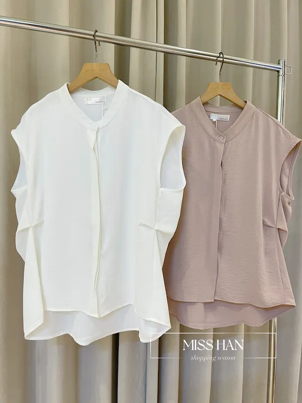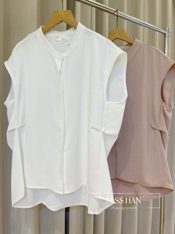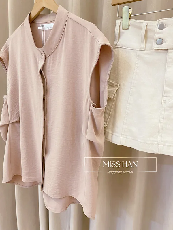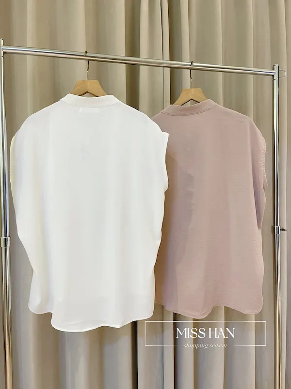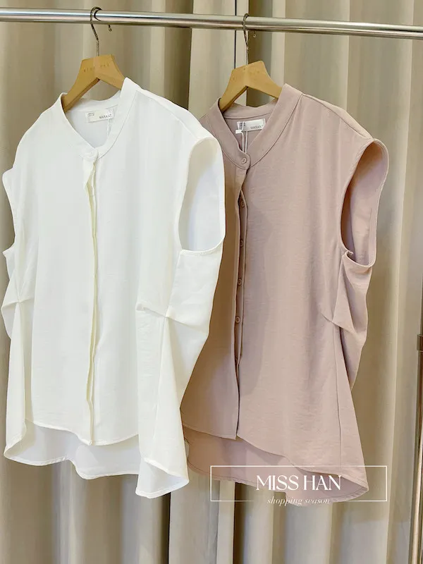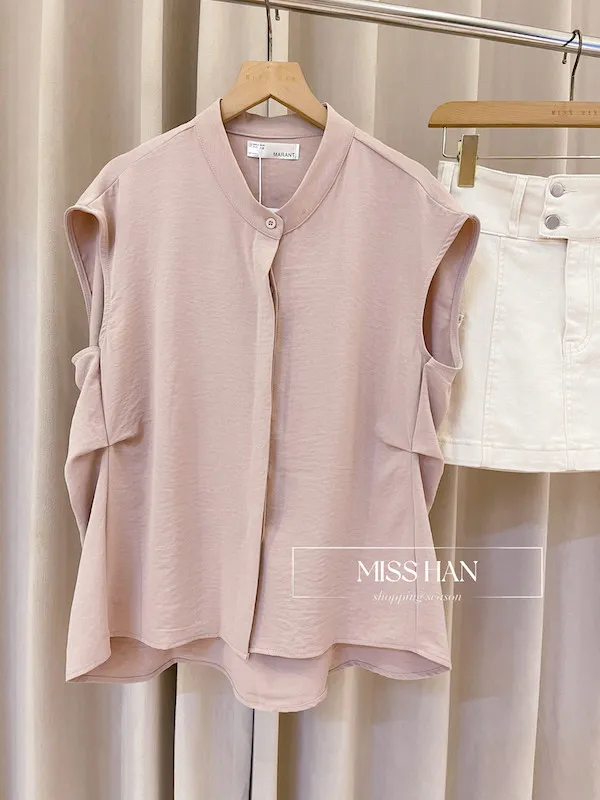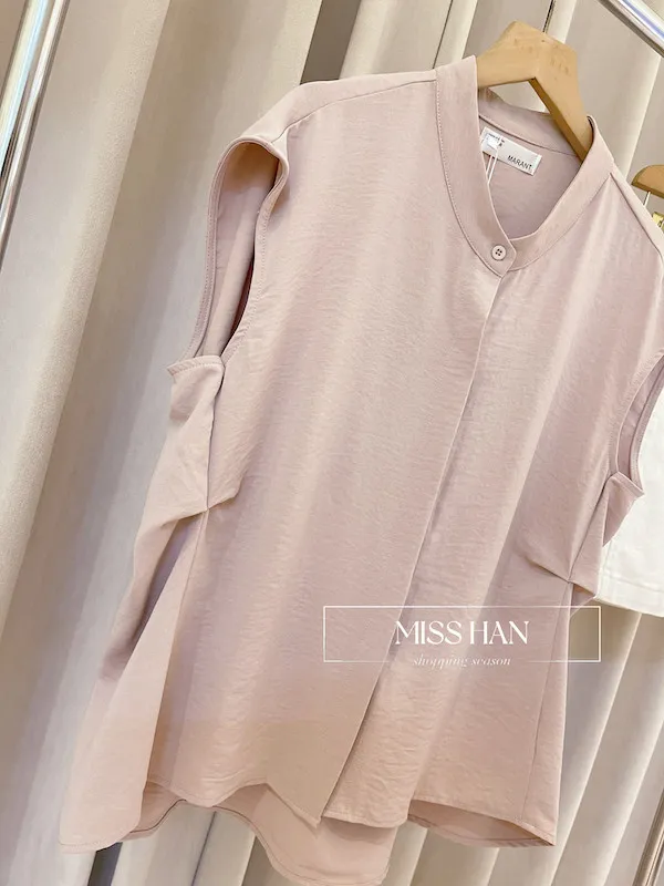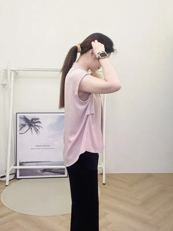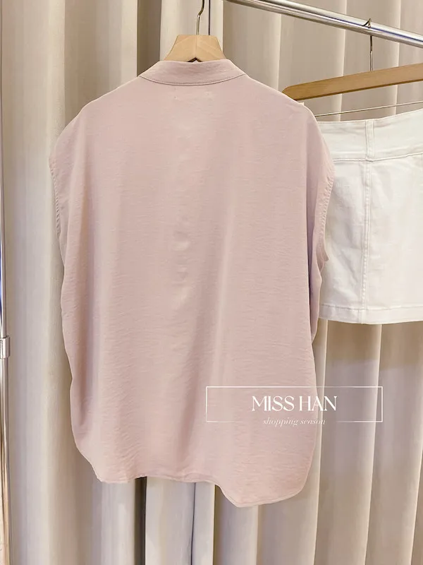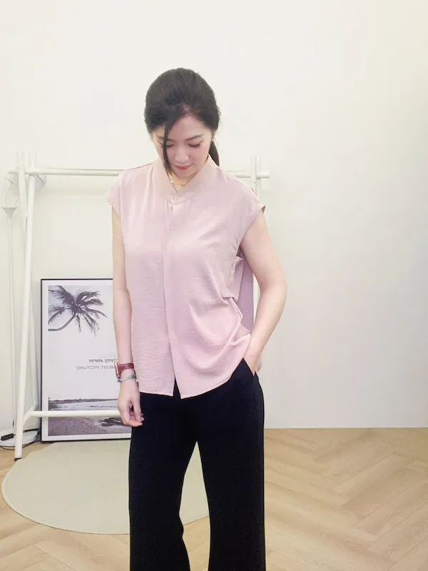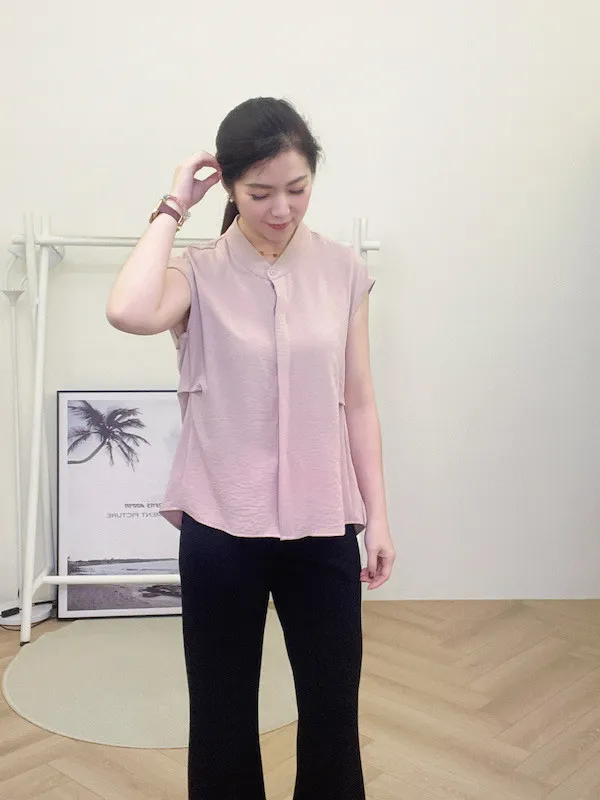 打造俐落時髦氣場!這款簡約粉色無袖上衣,襯衫領口搭配微落肩剪裁