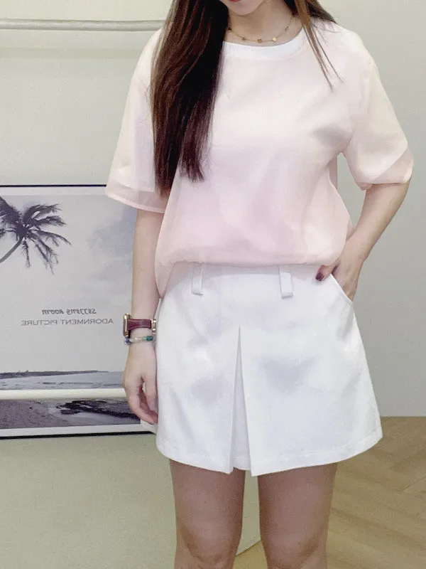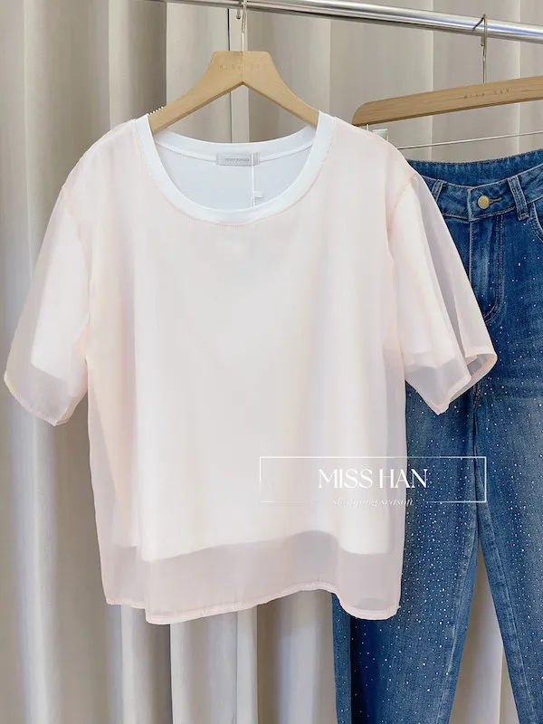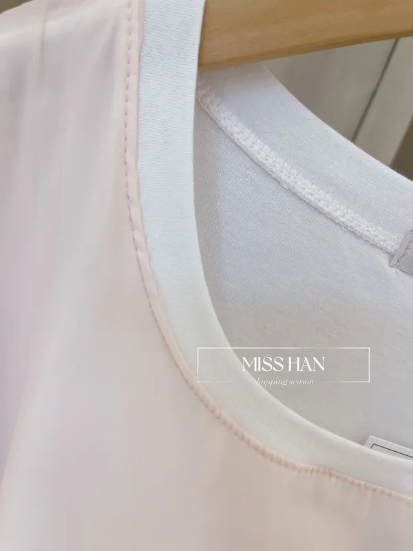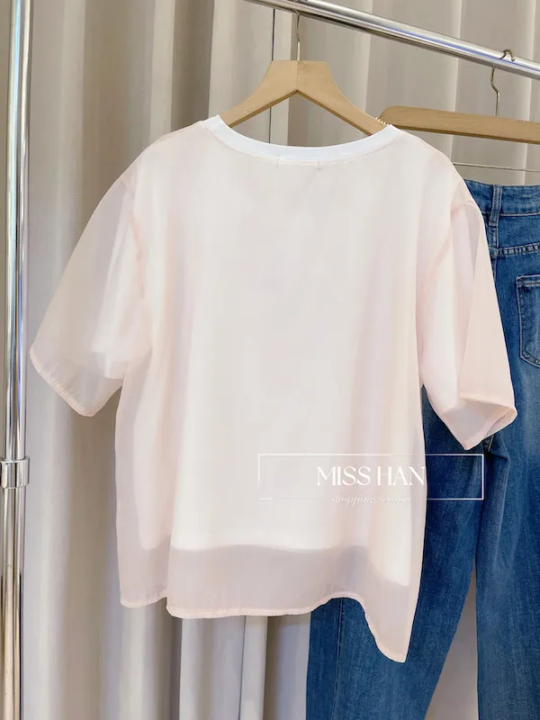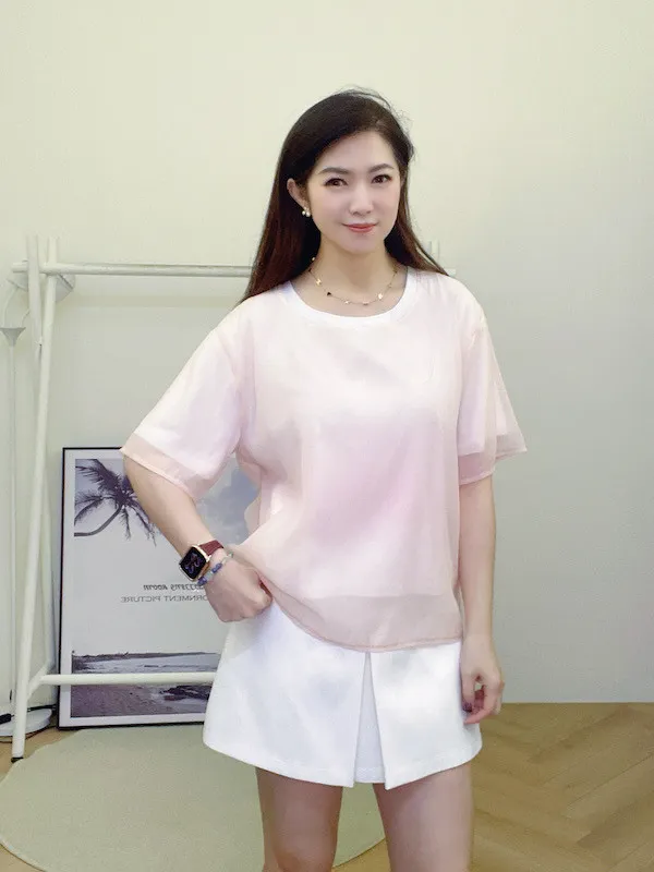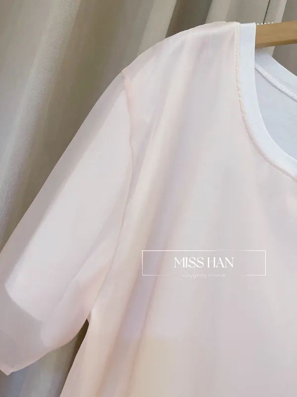 前後大面積精緻粉色細紗拼接,層次豐富且立體
