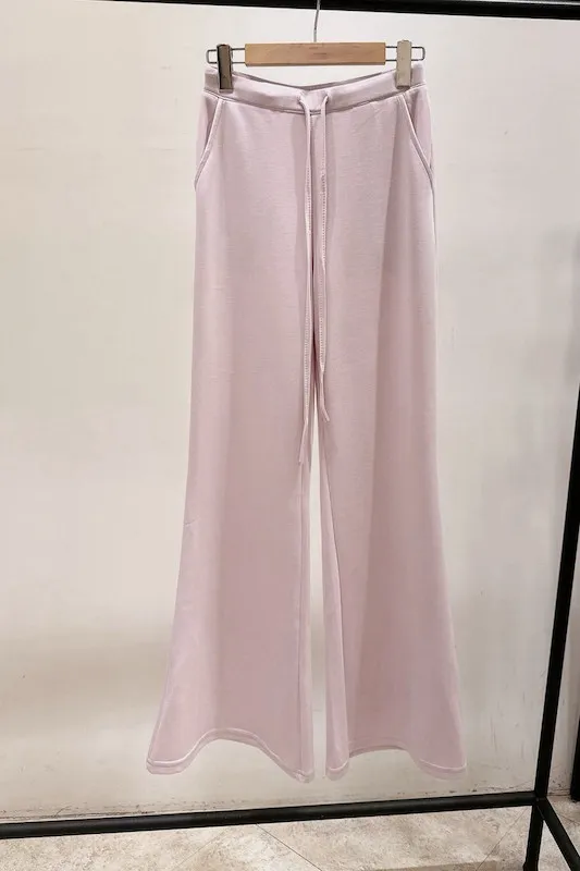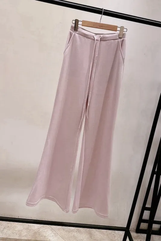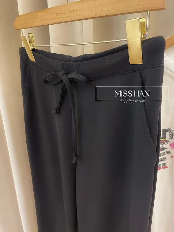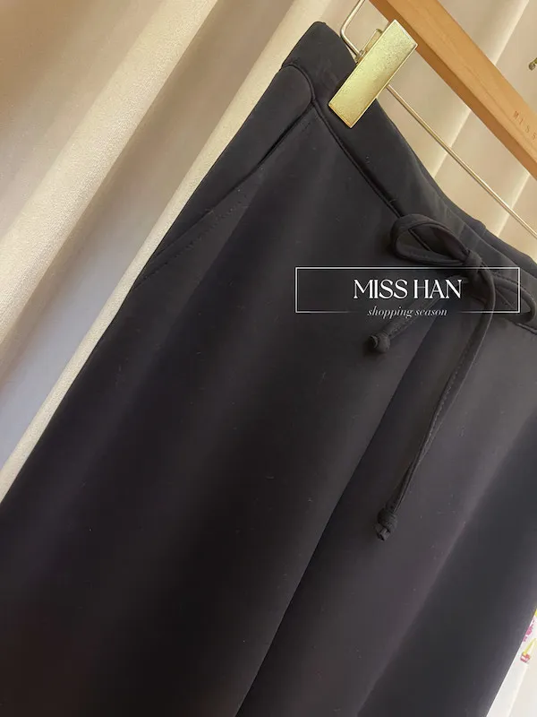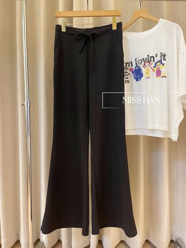 高腰抽繩設計完美包覆腰腹,結合修身的喇叭褲管,視覺上瞬間延伸腿部線條,穿出「大長腿」既視感。