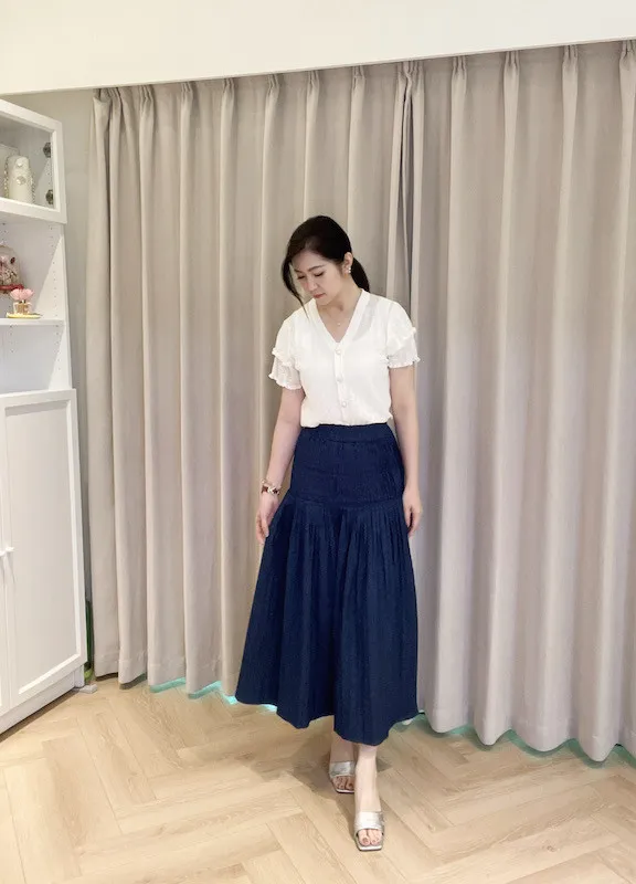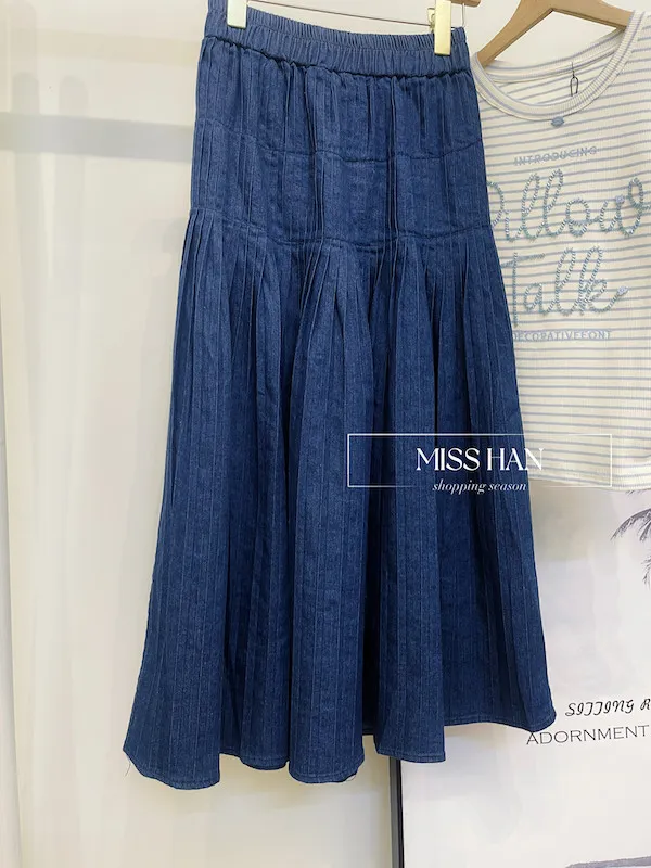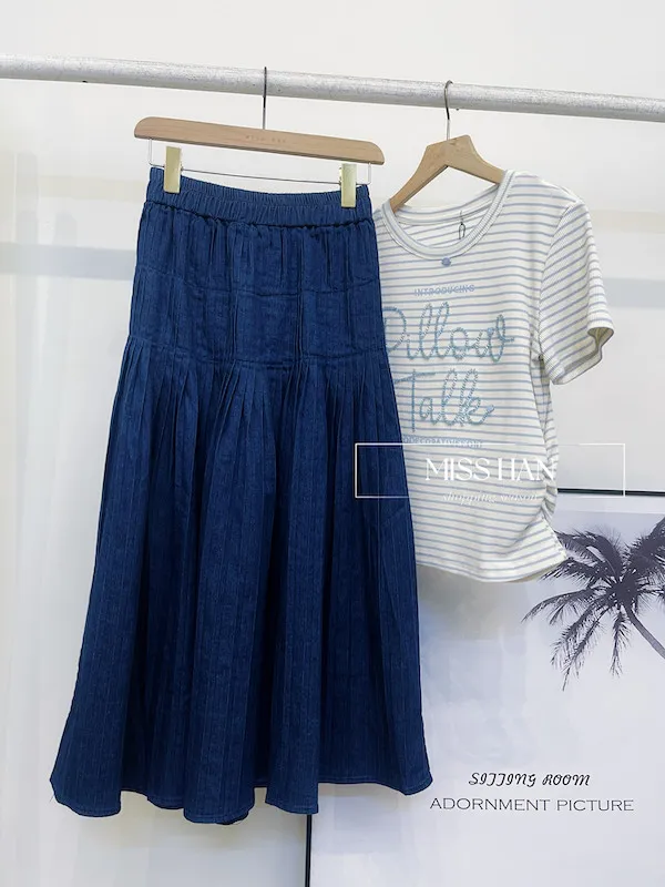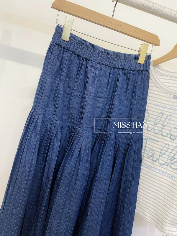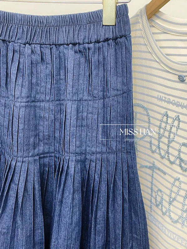 這款百褶牛仔半身裙是本季不容錯過的時尚單品,完美融合了休閒的牛仔風與甜美的百褶設計