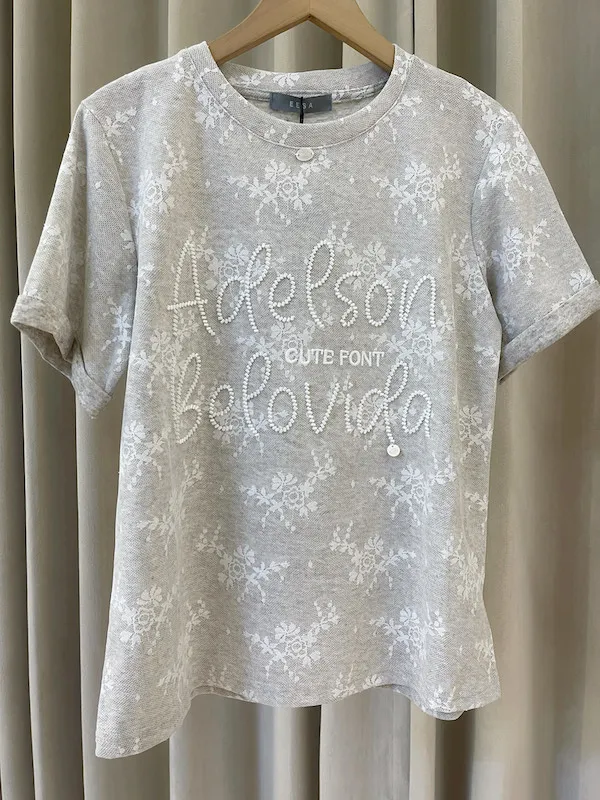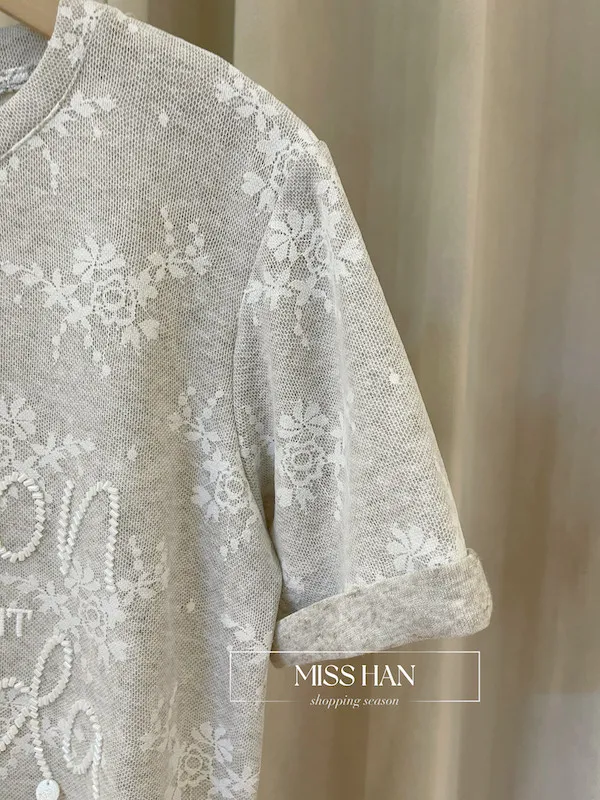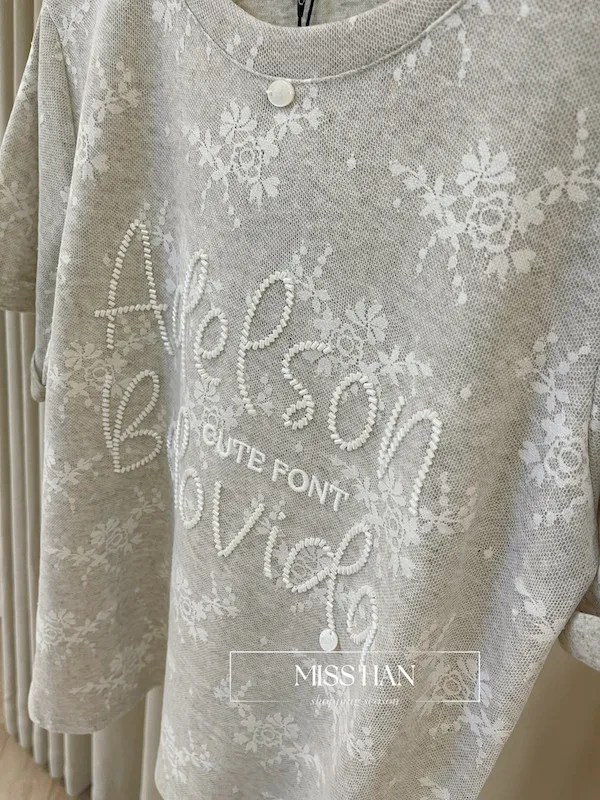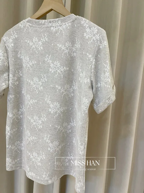這款灰色上衣絕對能打破妳對普通 T 恤的印象!我們在舒適、帶有彈性的灰色棉質面料上,層疊了整面的立體白色細紗蕾絲緹花。復古的玫瑰花紋精緻且唯美,為中性的灰色底布注入了滿滿的法式浪漫靈魂,營造出超美的層次感。