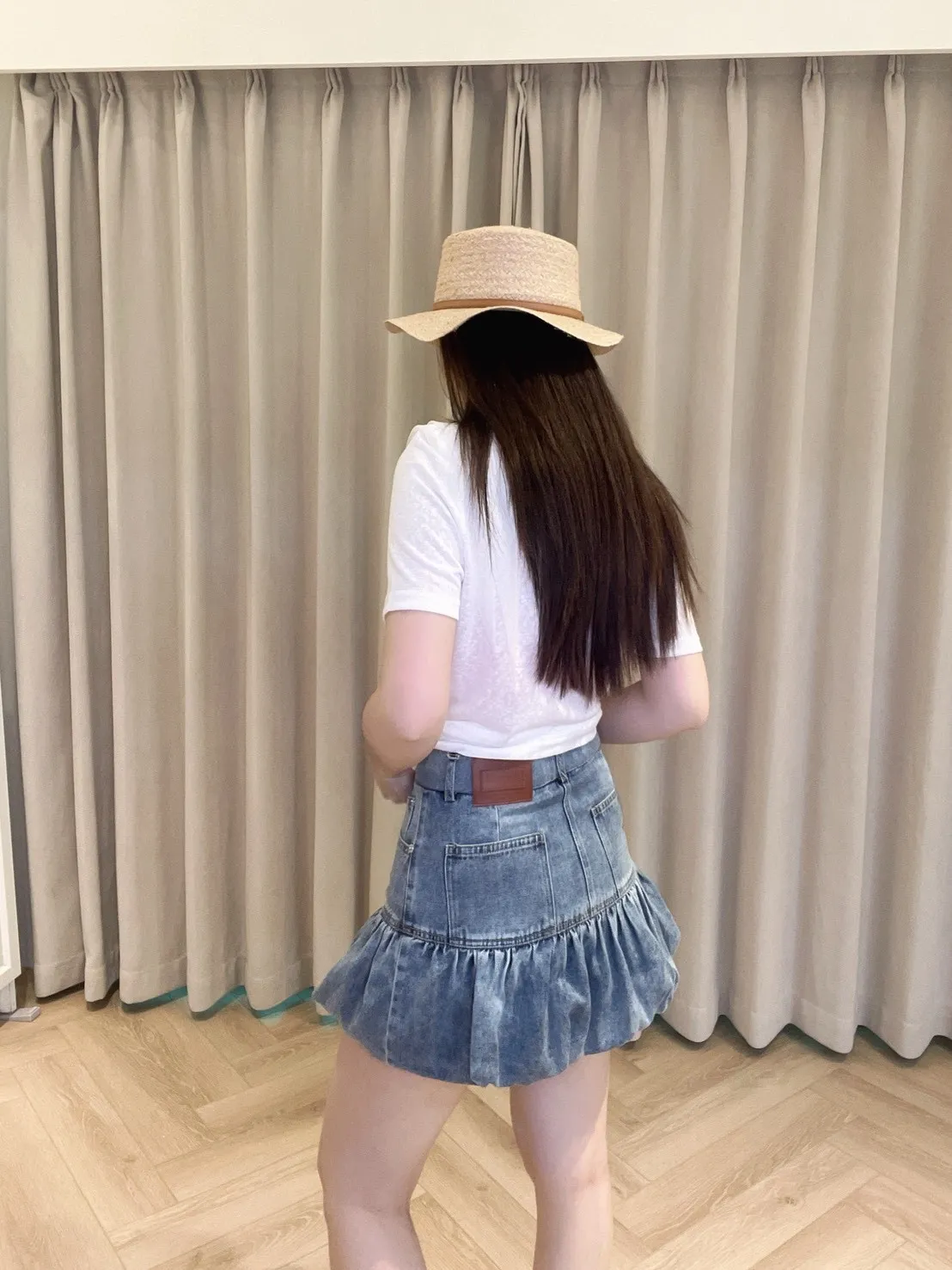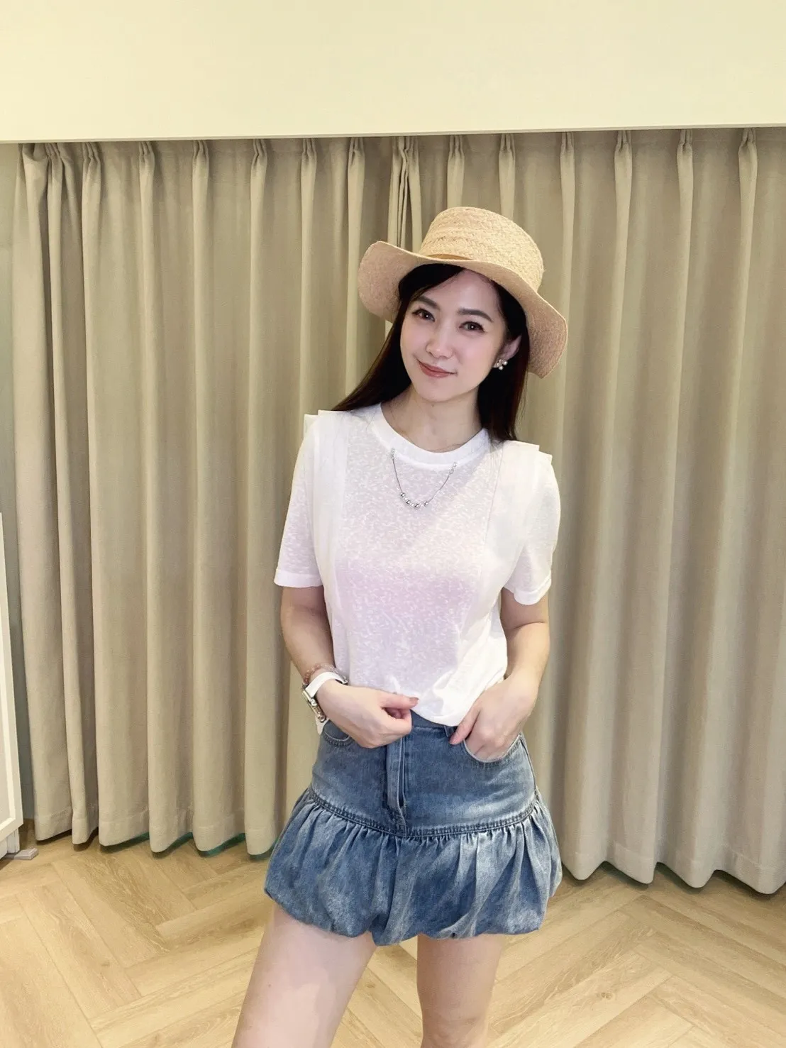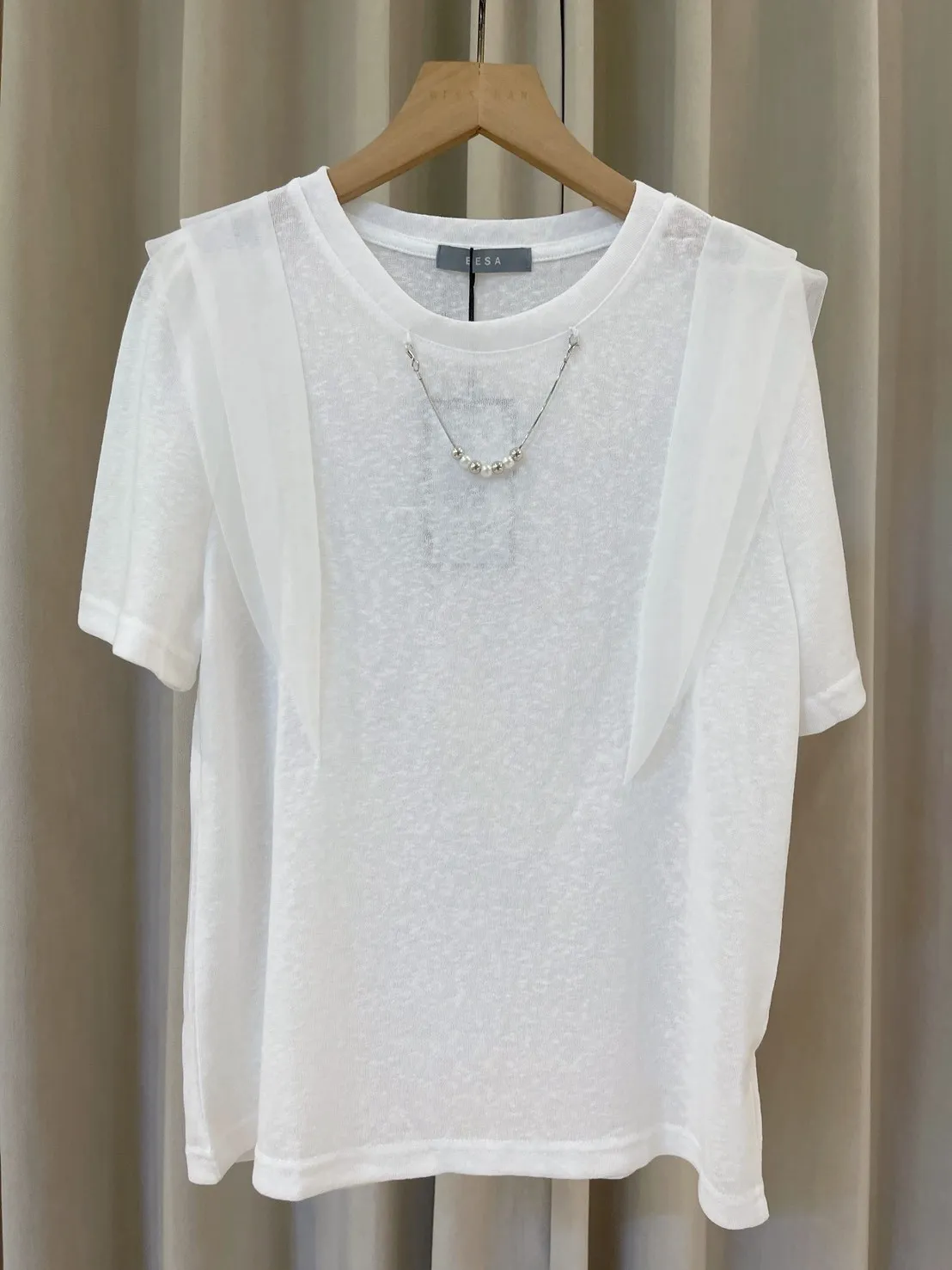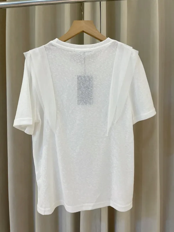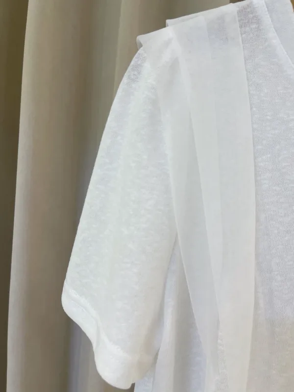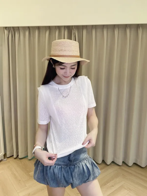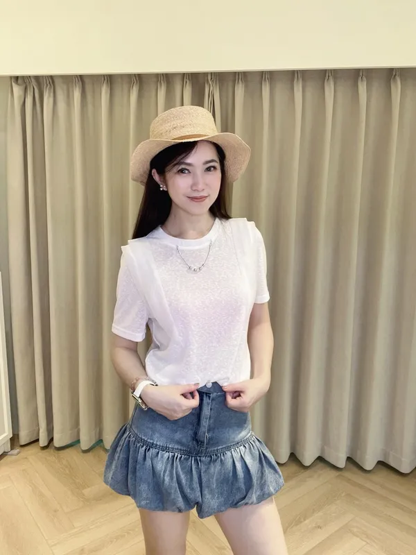採用具有微透感的輕盈棉料製作,觸感親膚透氣,在陽光下帶著若隱若現的高級感。最吸睛的設計莫過於肩膀兩側的異材質接紗,層次感的堆疊不僅修飾肩線,更為簡約的白T注入了溫柔的法式浪漫。