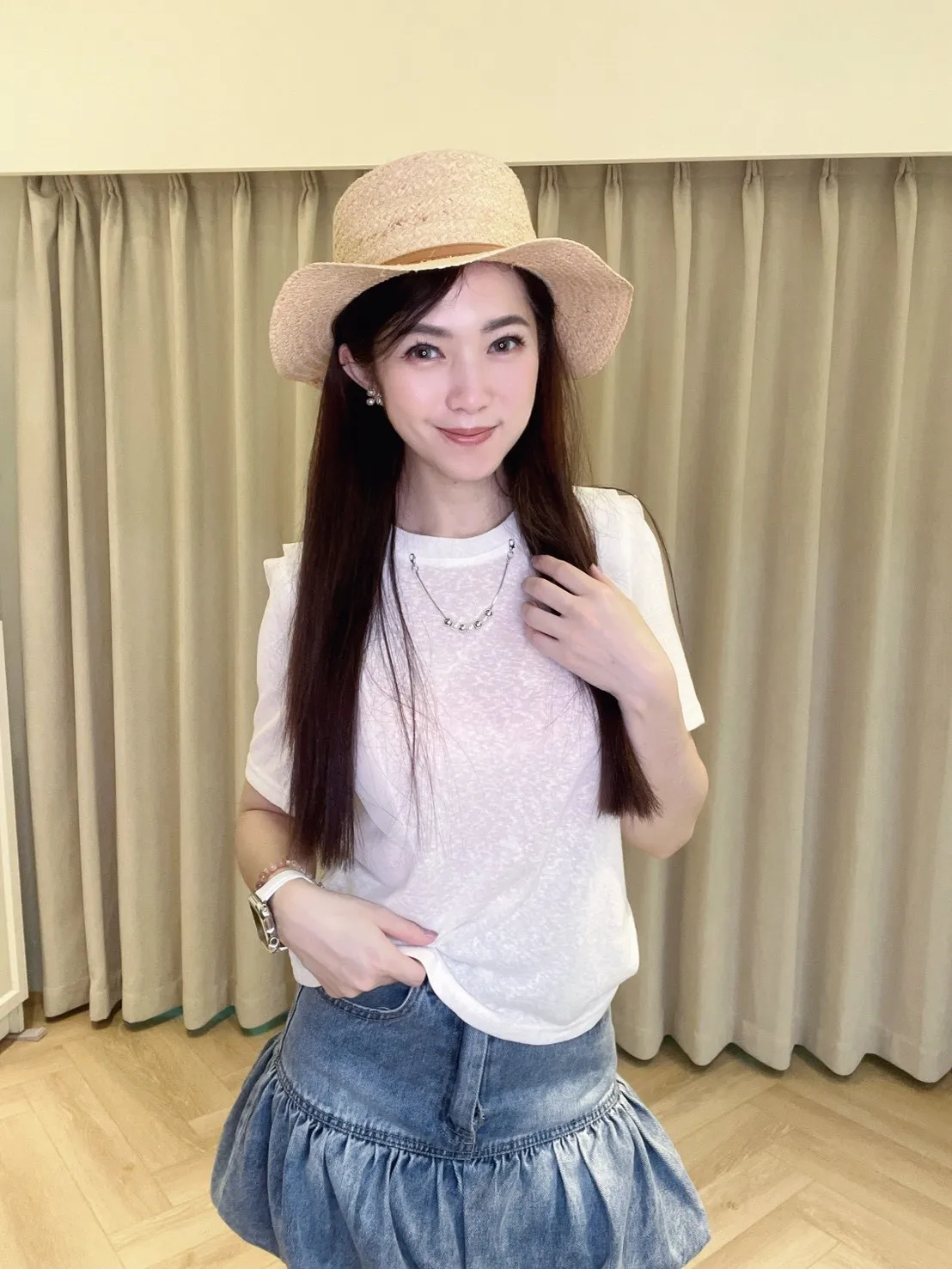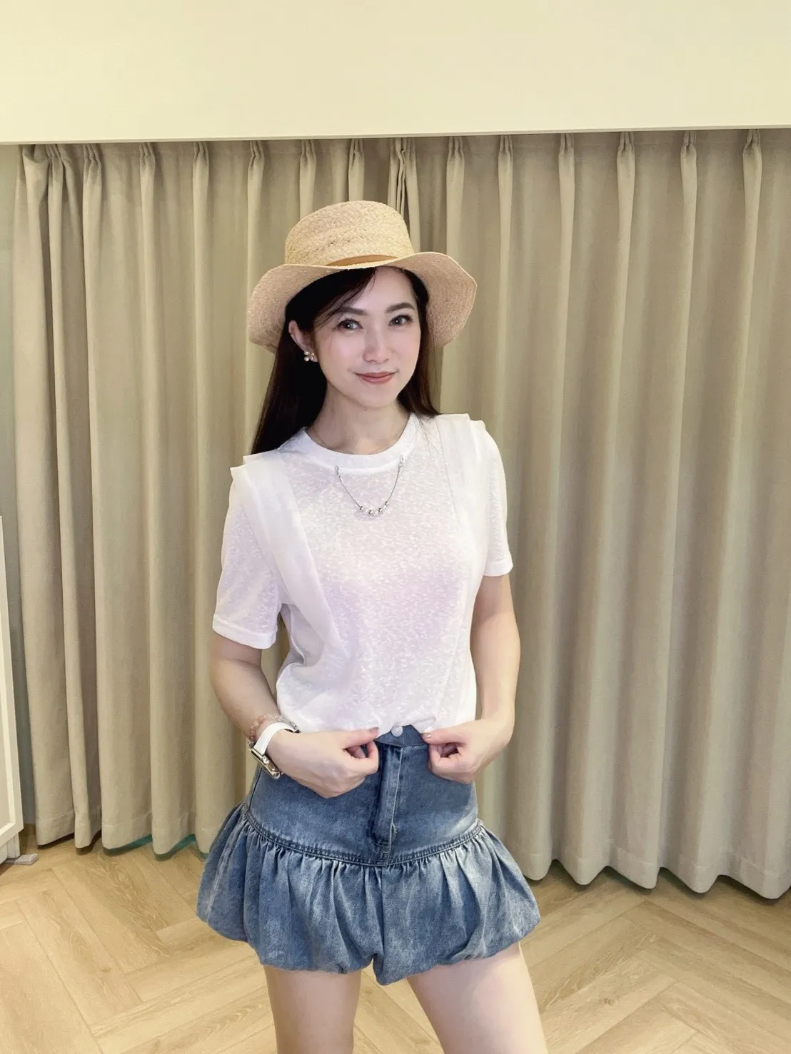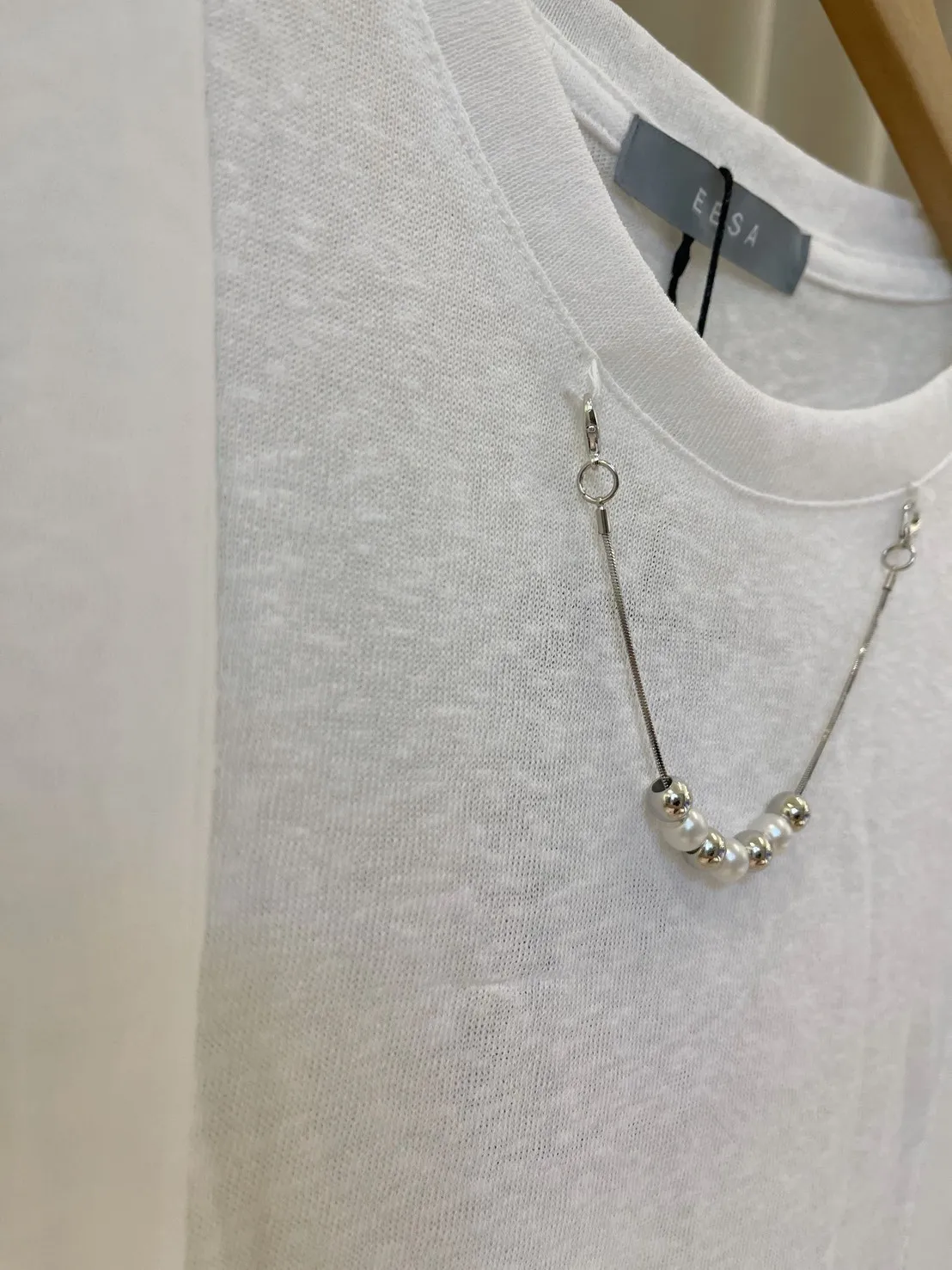 領口配有特製的珍珠金屬造型鍊條,省去了飾品搭配的煩惱;可拆卸式設計讓這件單品能隨心切換風格:繫上時優雅精緻,拆下後則是清爽迷人的層次上衣。純白色調百搭不挑人,隨意搭配牛仔褲或西裝褲,就能輕鬆營造出韓系小姐姐的精緻氛圍。