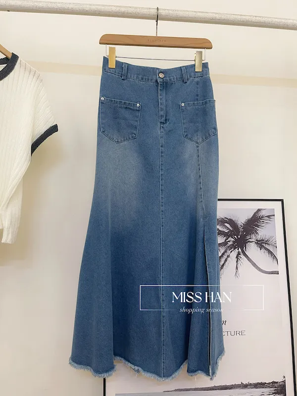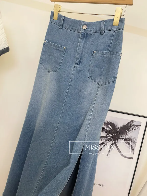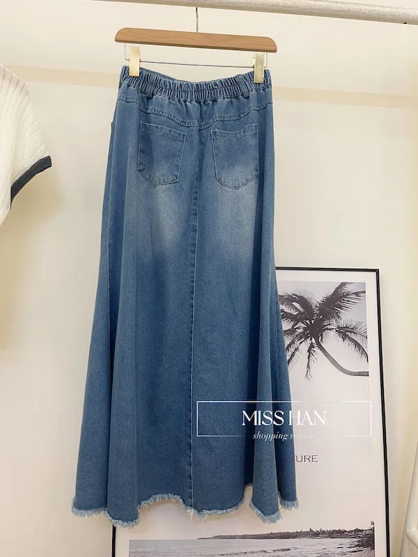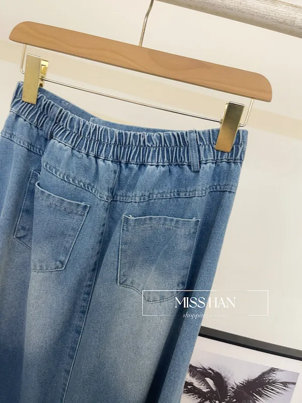 🕒 經典不敗:單寧開叉彈性腰牛仔半身裙