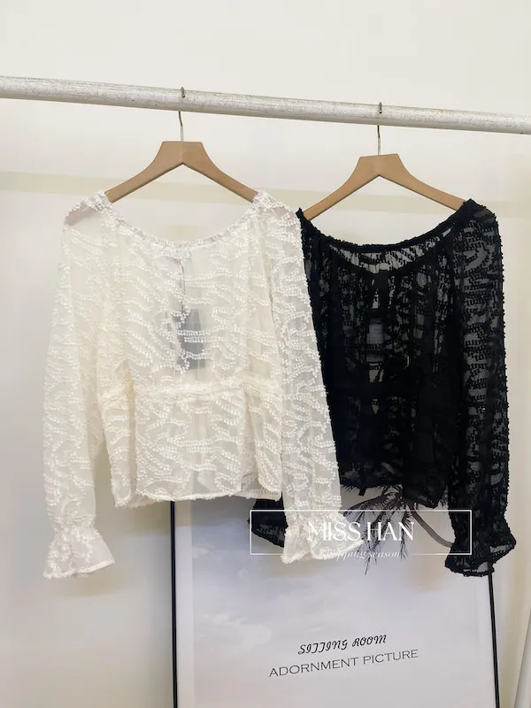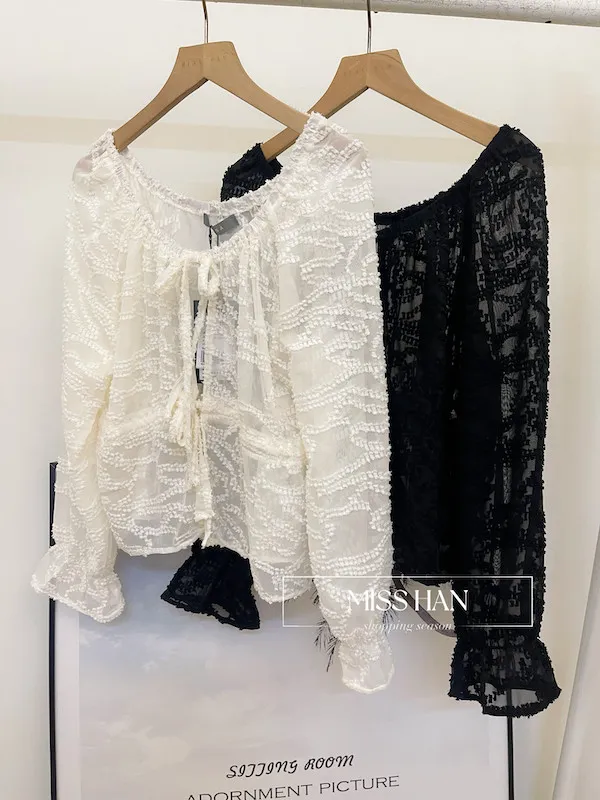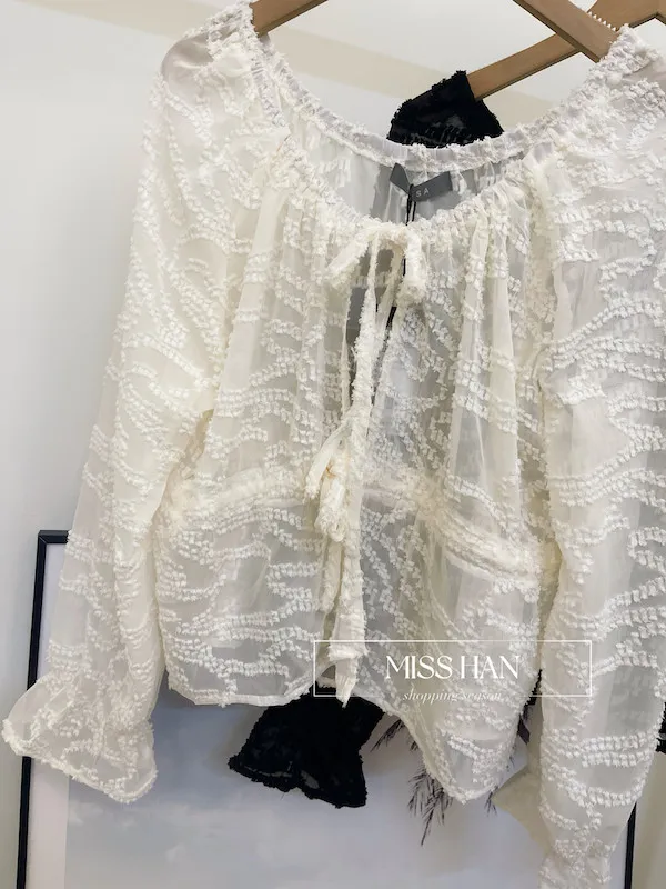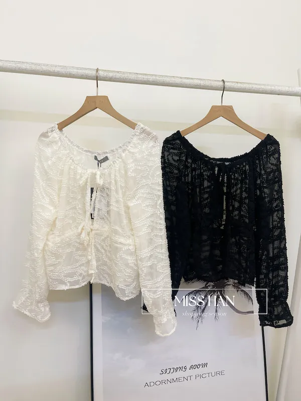 🕊️ 輕盈呼吸感:立體緹花前綁繩透紗罩衫