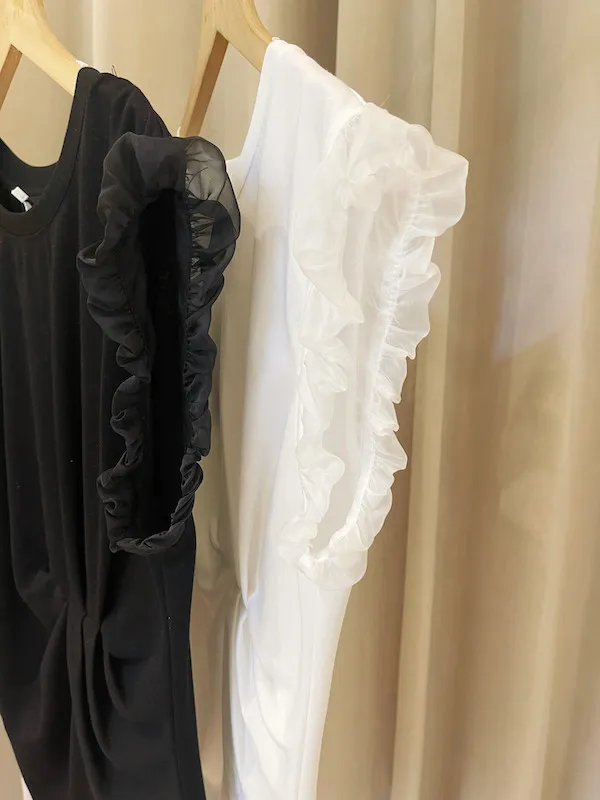 仙氣澎紗袖: 肩膀處疊加了細緻的網紗澎袖,不僅自帶浪漫濾鏡,更巧妙地修飾了手臂線條,讓妳告別在意的小肉肉。