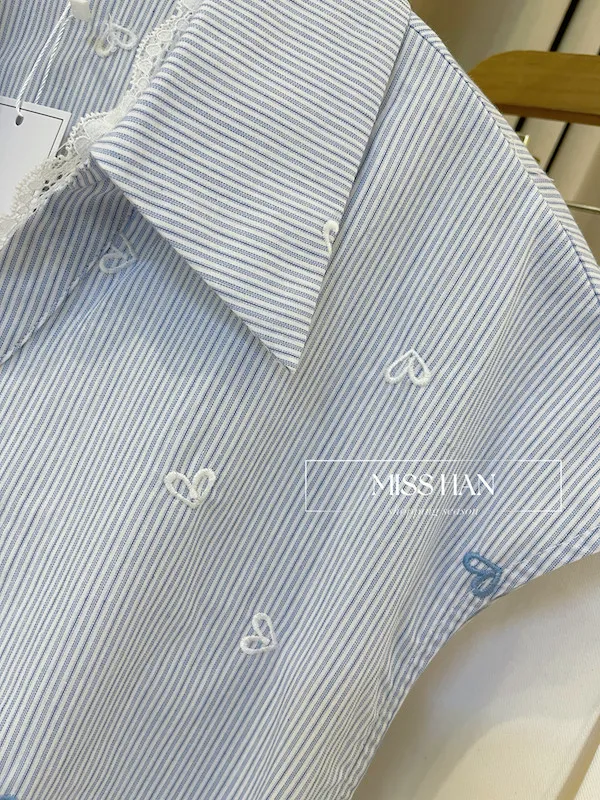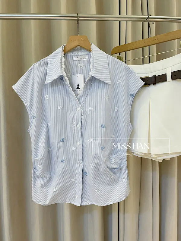 各位細節控女孩快集合!這款襯衫絕對要收入衣櫃,乍看是清爽的經典藍白直紋,近看真的會被美哭——滿版的精緻刺繡小愛心,藍白交織的立體感,讓原本正式的襯衫瞬間多了份韓系的溫柔俏皮感。✨