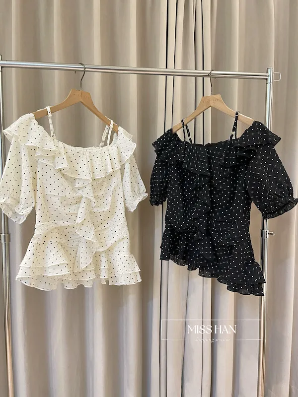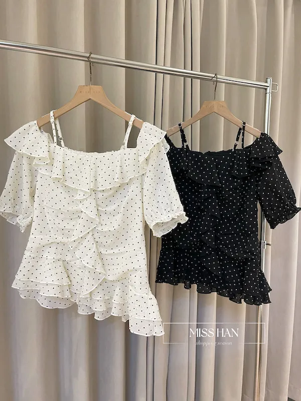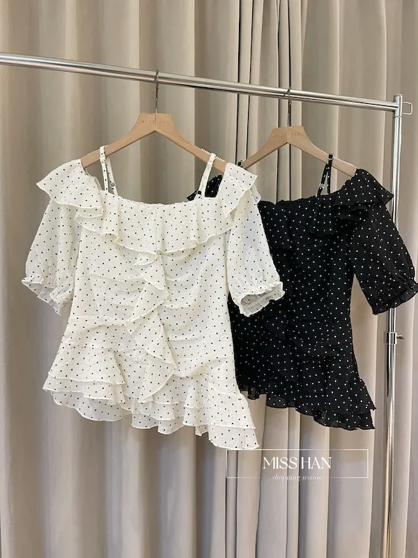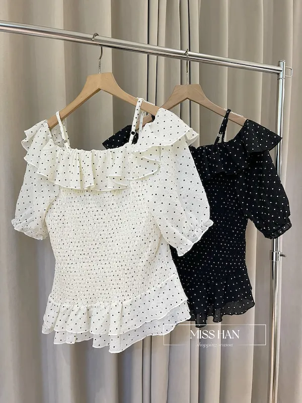 ✨ 【浪漫法式・心動預警】壓皺細點點一字領上衣 ✨